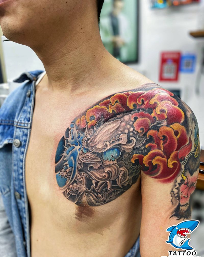 当前位置: 首页 >山东省威海市纹身店-威海玩刺青工作室纹身图案>福狮纹身图片_胸部新传统纹身图案
