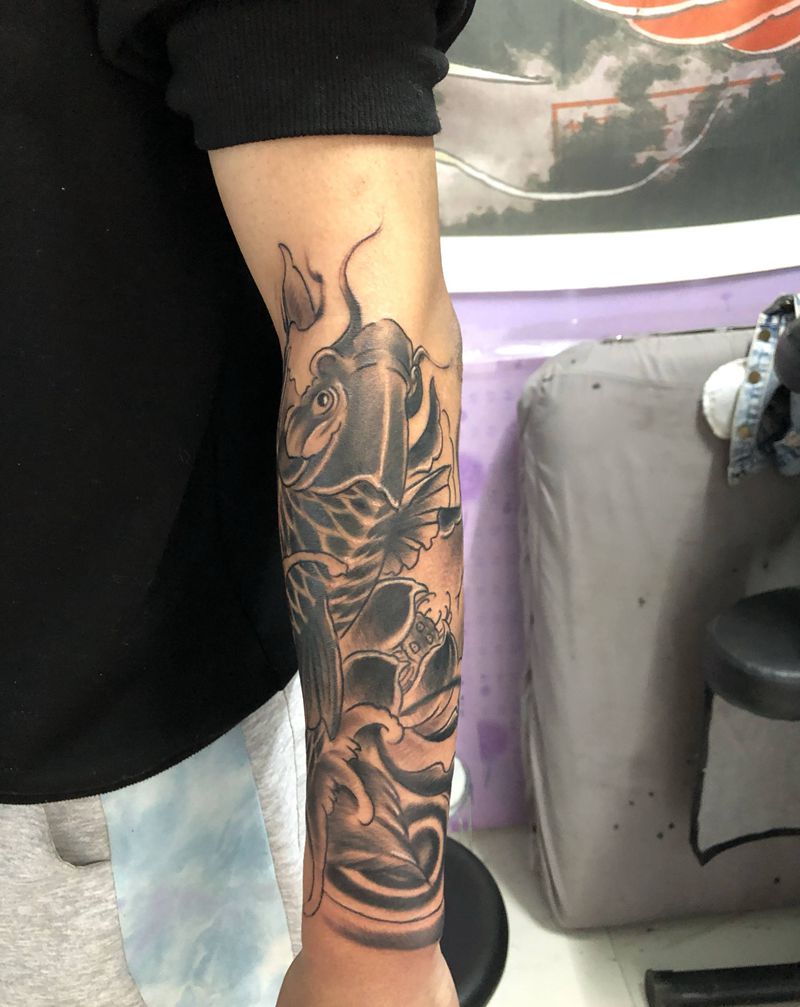 当前位置: 首页 >山东省泰安市纹身店-匠刺青纹身图案>小臂鲤鱼遮盖全包纹身图片_手臂新传统纹身图案