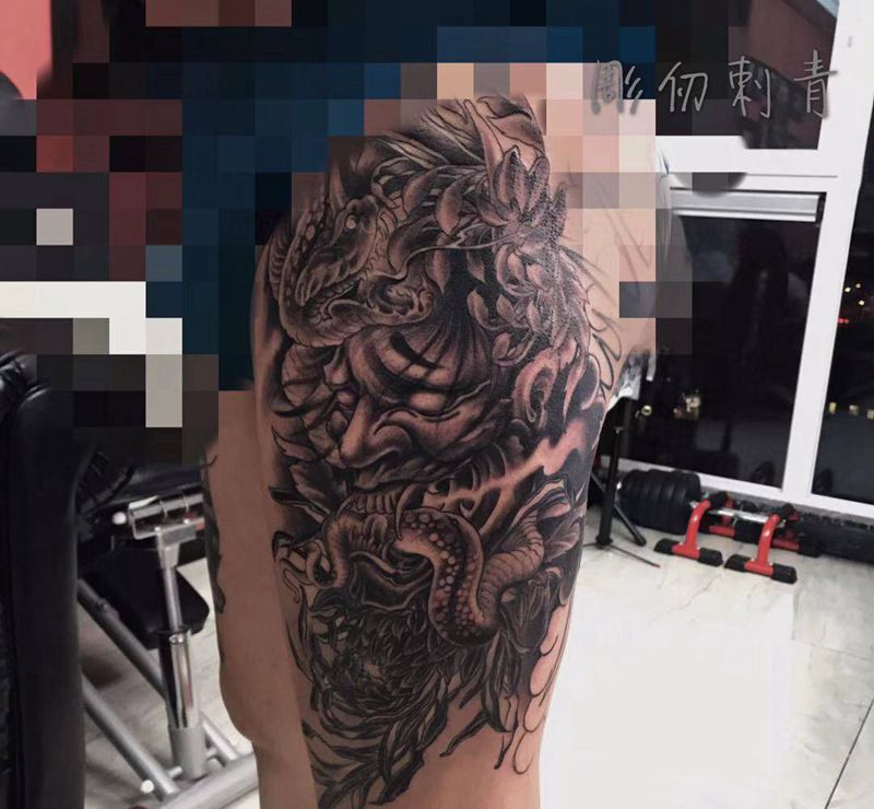 • T网红王老大花腿龙纹身图片_腿部新传统纹身图案