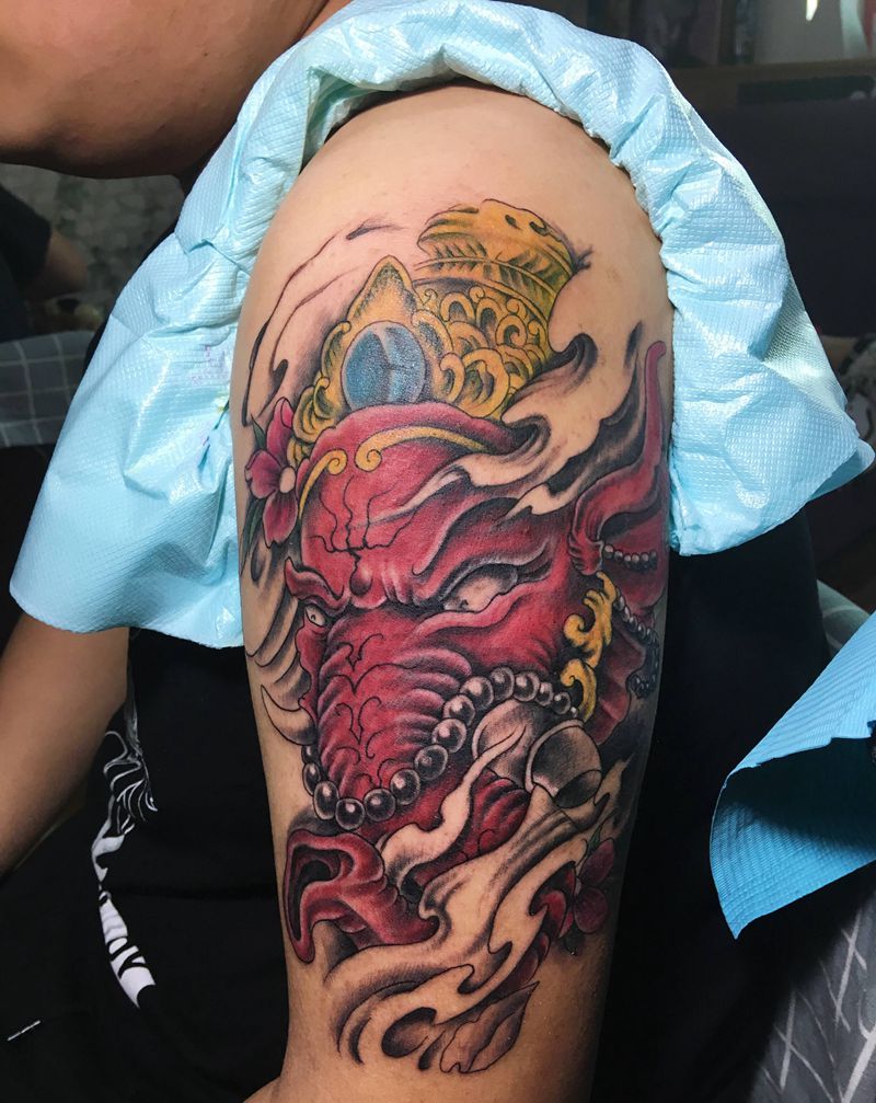 当前位置: 首页 >山东省威海市纹身店-大鹏刺青纹身图案>象神纹身图片_手臂新传统纹身图案