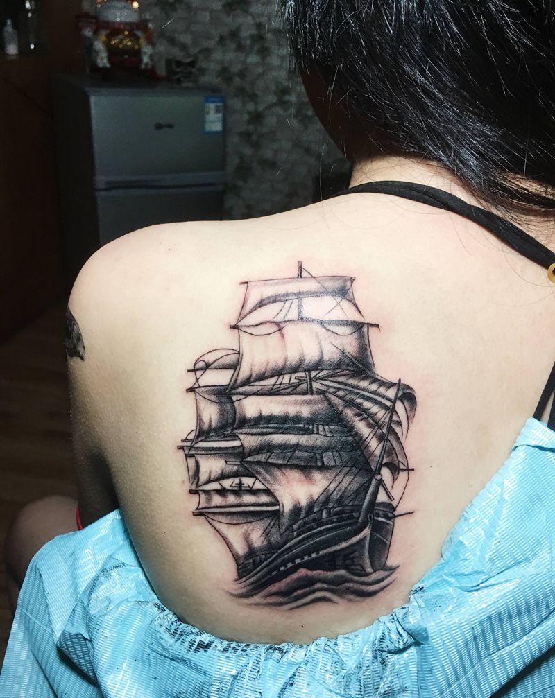 帆船纹身图片_肩部纹身图案