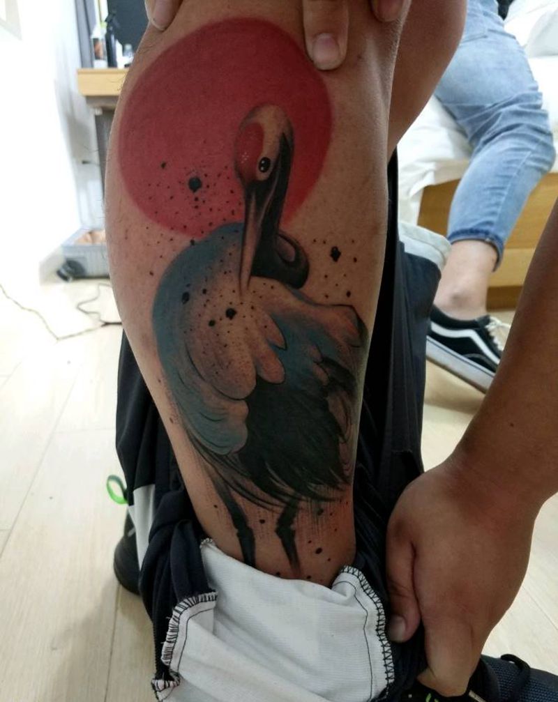 仙鹤(祥和)纹身图片_腿部水彩纹身图案