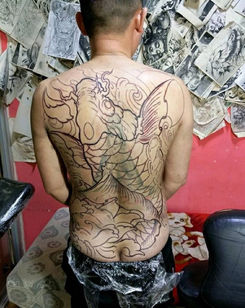 未完成作品,鲤鱼遮盖。纹身图片_背部新传统纹身图案