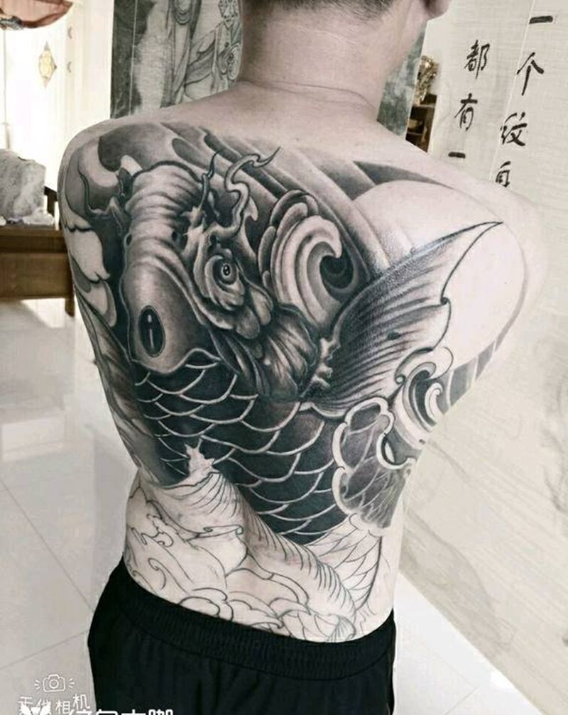 未完成作品,鲤鱼遮盖。纹身图片_背部新传统纹身图案