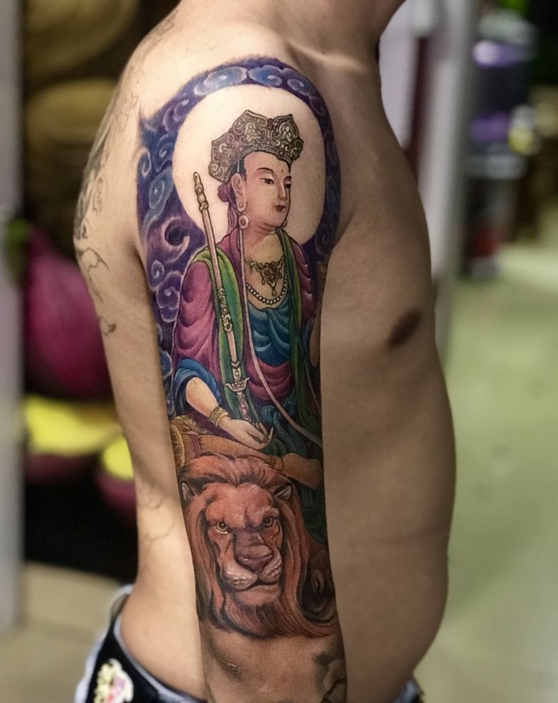 文殊菩萨孙悟空花臂纹身图片_手臂新传统纹身图案