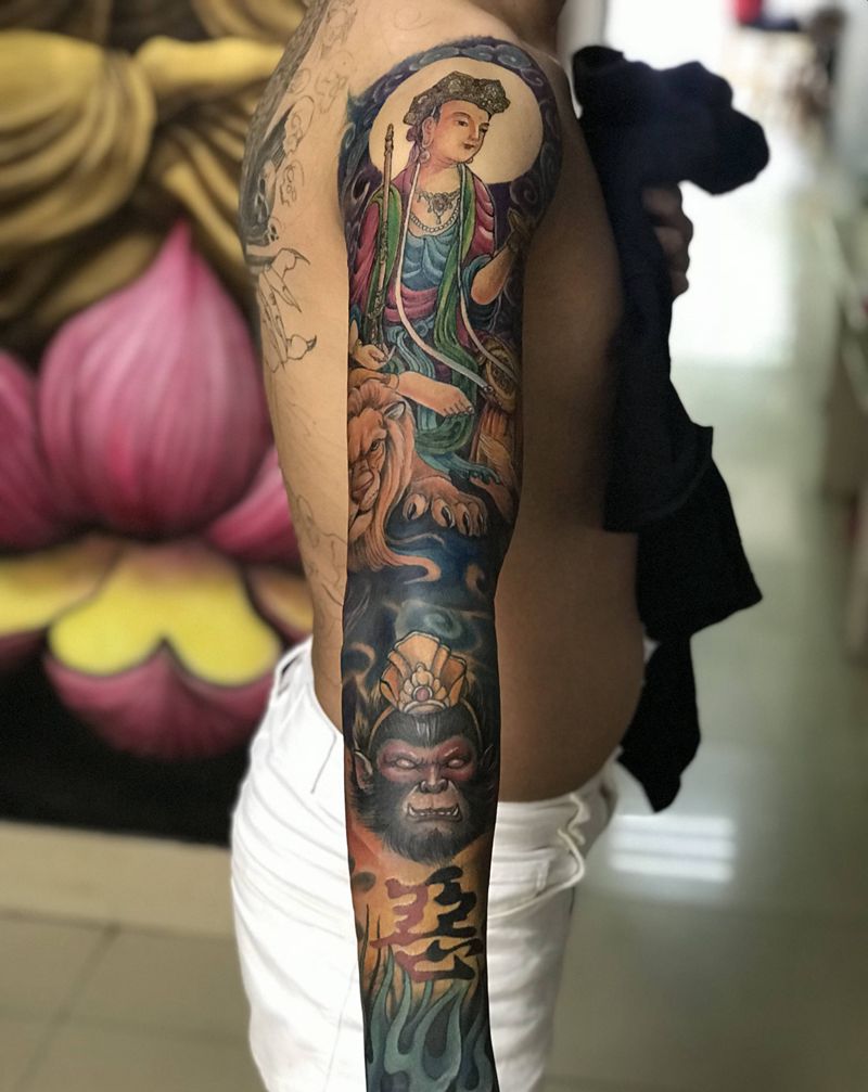 文殊菩萨孙悟空花臂纹身图片_手臂新传统纹身图案