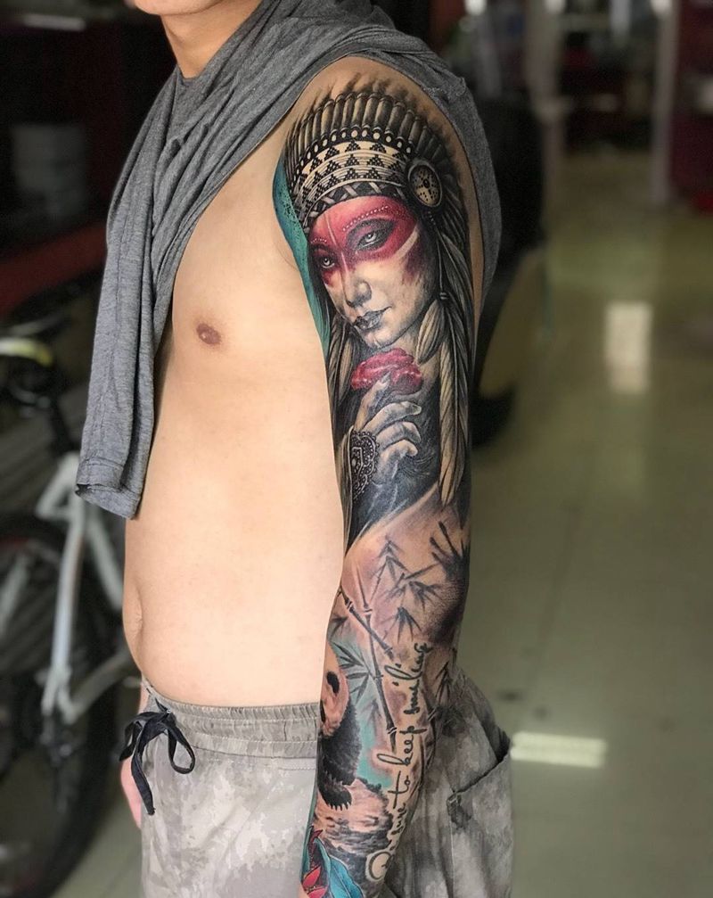 当前位置: 首页 >山东省济宁市纹身店-东龙纹身纹身图案>印第安人和熊猫纹身图片_手臂欧美写实水墨纹身图案