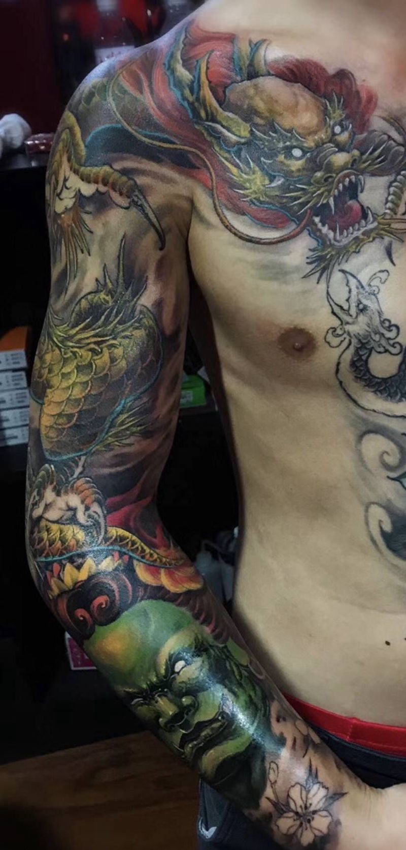 • T网红王老大花腿龙纹身图片_腿部新传统纹身图案