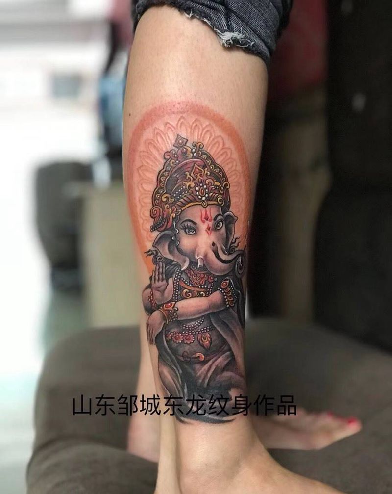 当前位置: 首页 >山东省济宁市纹身店-东龙纹身纹身图案>小腿象神纹身图片_成品腿部传统人物鬼神纹身图案