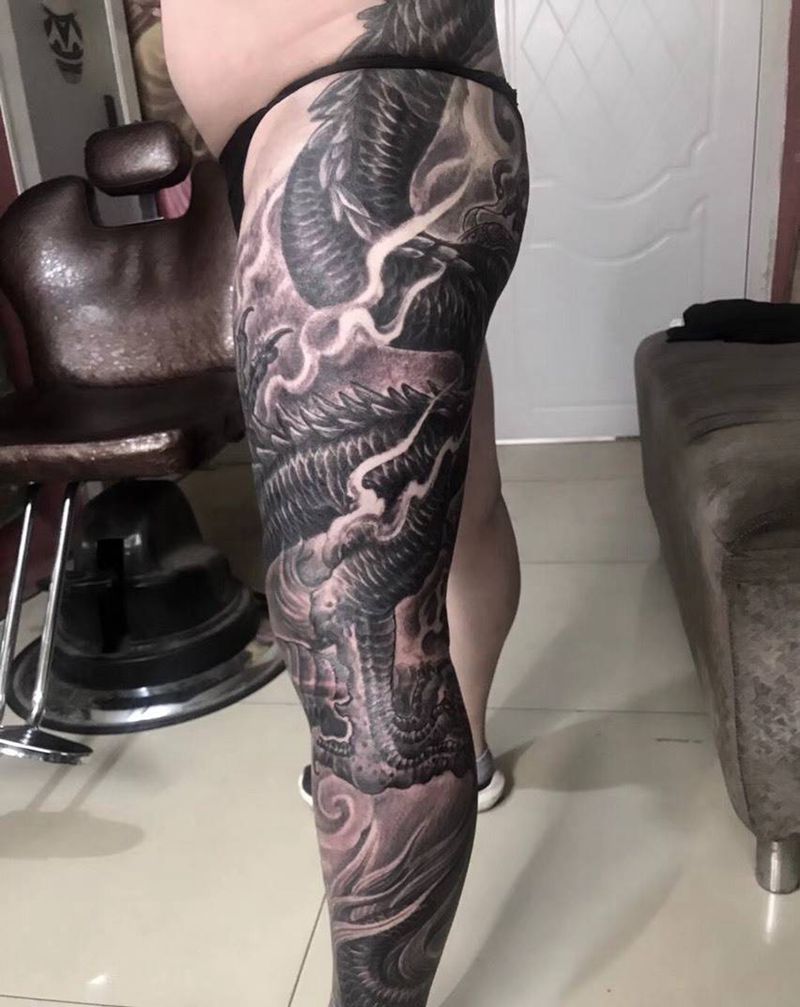 • T网红王老大花腿龙纹身图片_腿部新传统纹身图案