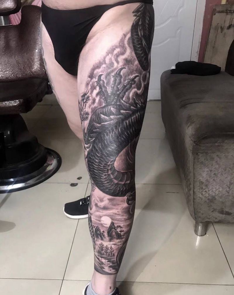 • T网红王老大花腿龙纹身图片_腿部新传统纹身图案