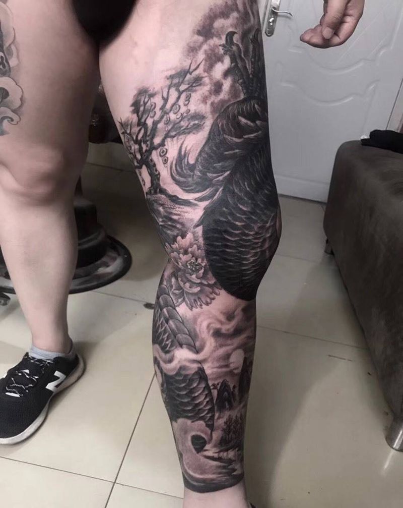 • T网红王老大花腿龙纹身图片_腿部新传统纹身图案