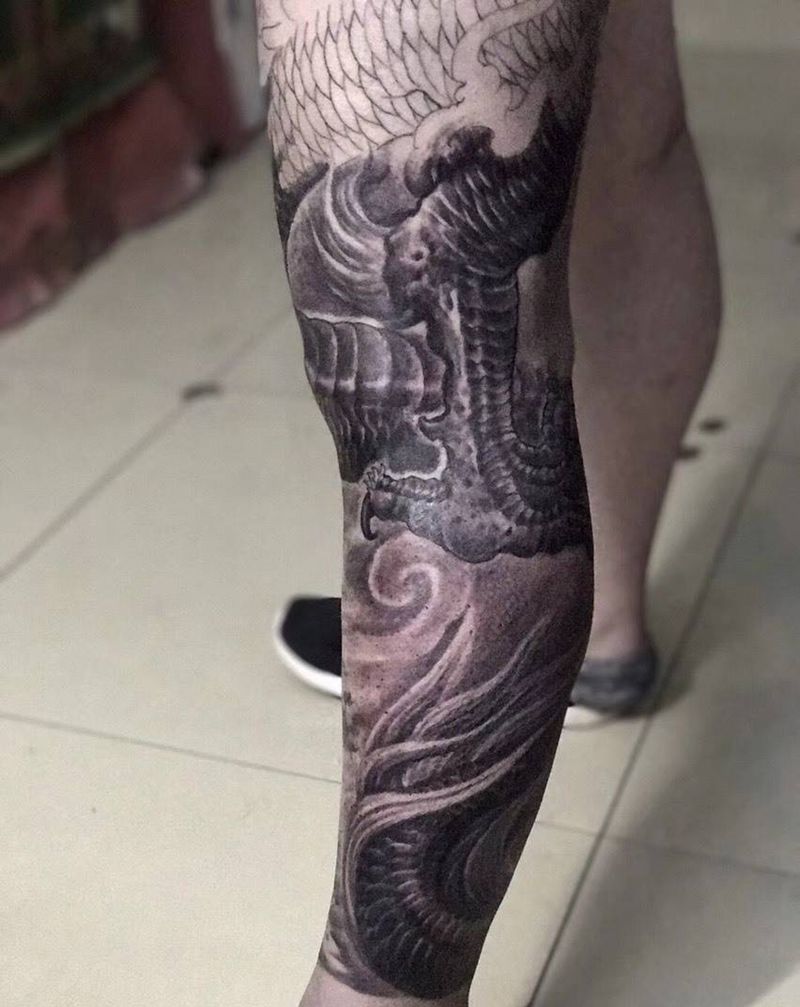 • T网红王老大花腿龙纹身图片_腿部新传统纹身图案