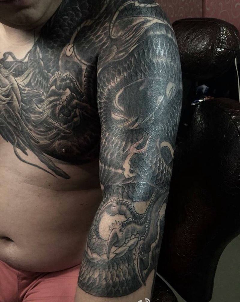 当前位置: 首页 >山东省济宁市纹身店-东龙纹身纹身图案>过肩龙花臂遮盖纹身图片