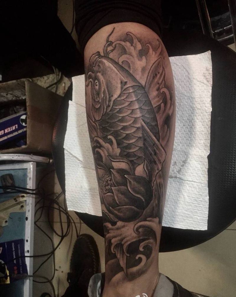 当前位置: 首页 >山东省济宁市纹身店-东龙纹身纹身图案>小腿鲤鱼纹身图片