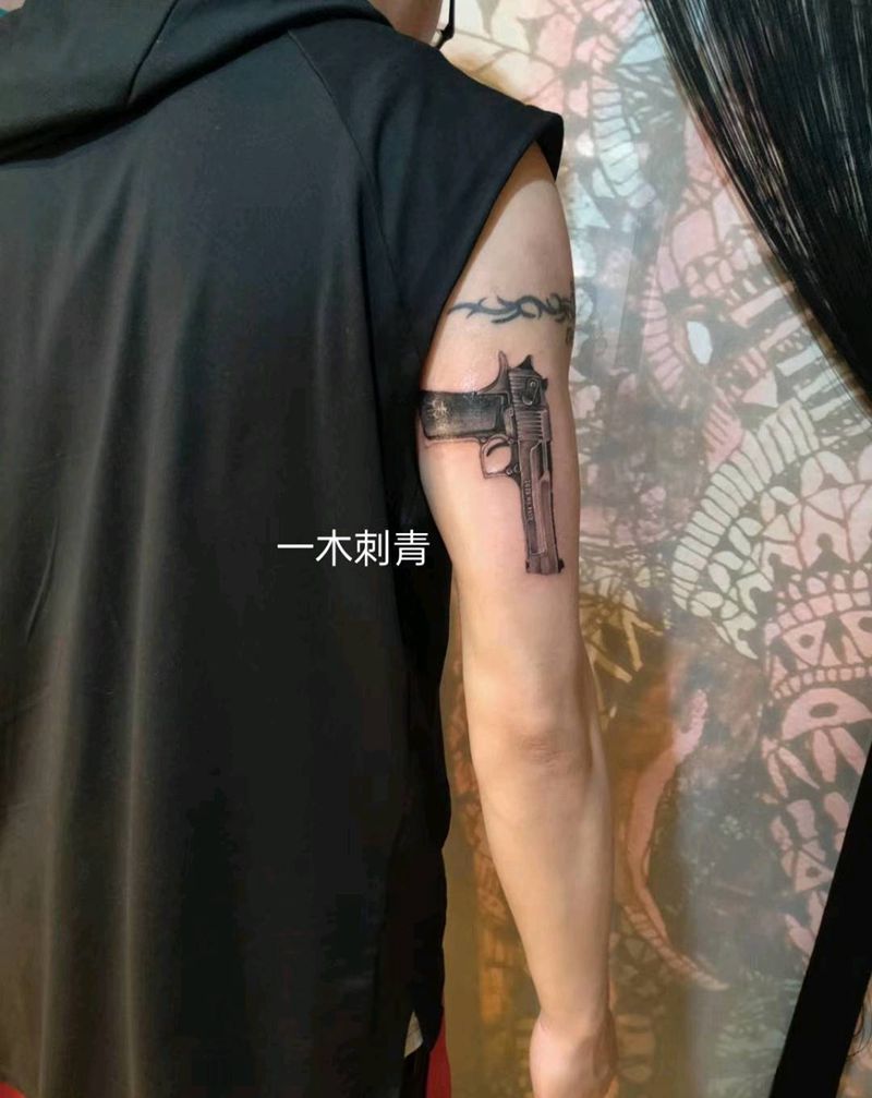 当前位置: 首页 >山东省济宁市纹身店-邹城一木刺青纹身图案>沙漠之鹰手枪纹身图片_手臂欧美写实纹身图案