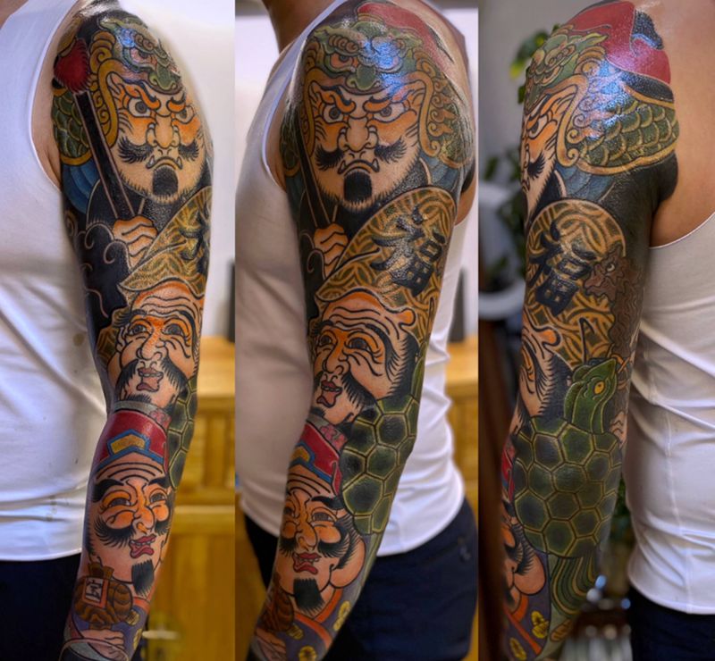 当前位置: 首页 >山东省威海市纹身店-谛听刺青纹身图案>《七福神》花臂纹身图片_肩部手臂老传统Old School老传统花臂日式遮盖纹身图案
