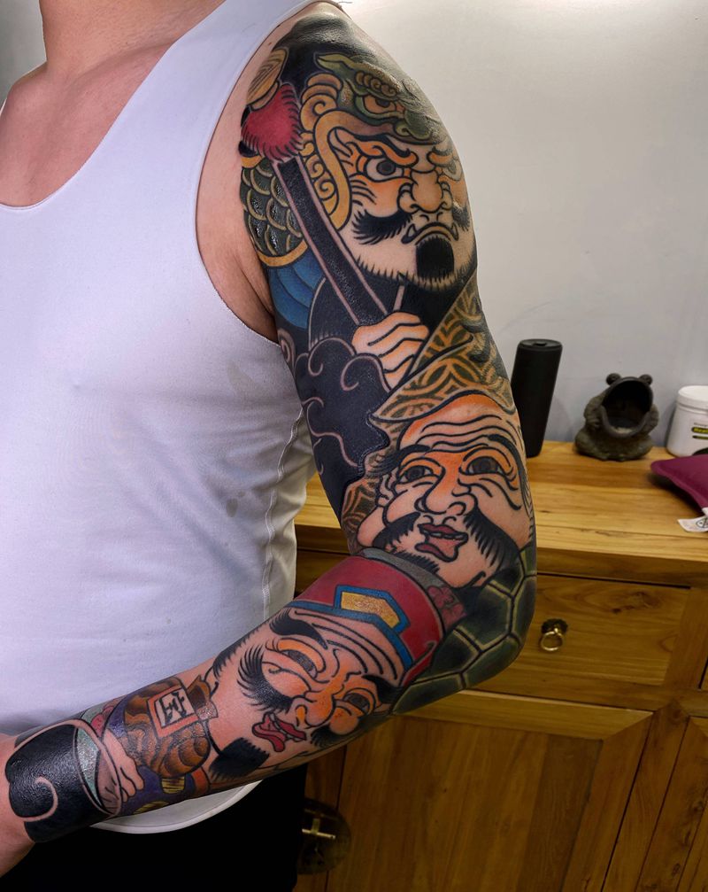 当前位置: 首页 >山东省威海市纹身店-谛听刺青纹身图案>《七福神》花臂纹身图片_肩部手臂老传统Old School老传统花臂日式遮盖纹身图案
