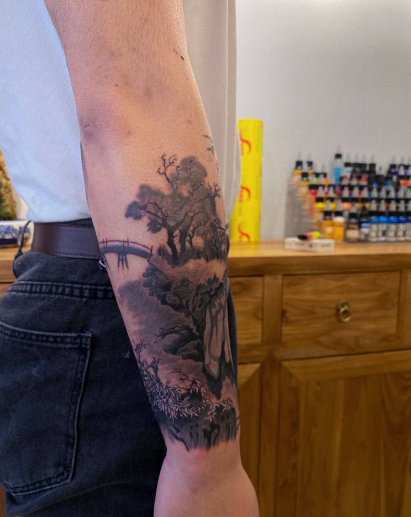 当前位置: 首页 >山东省威海市纹身店-谛听刺青纹身图案>水墨纹身图片_手臂手部水彩水墨山水石头纹身图案
