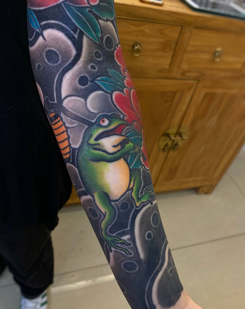 当前位置: 首页 >山东省威海市纹身店-谛听刺青纹身图案>老传统牡丹花臂纹身图片_肩部手臂老传统牡丹花臂牡丹花蛙纹身图案