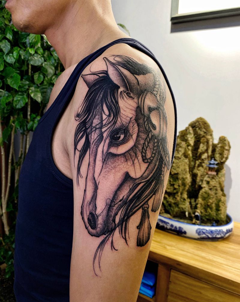当前位置: 首页 >山东省威海市纹身店-谛听刺青纹身图案>点刺马纹身图片_肩部手臂点刺马铃铛马纹身图案