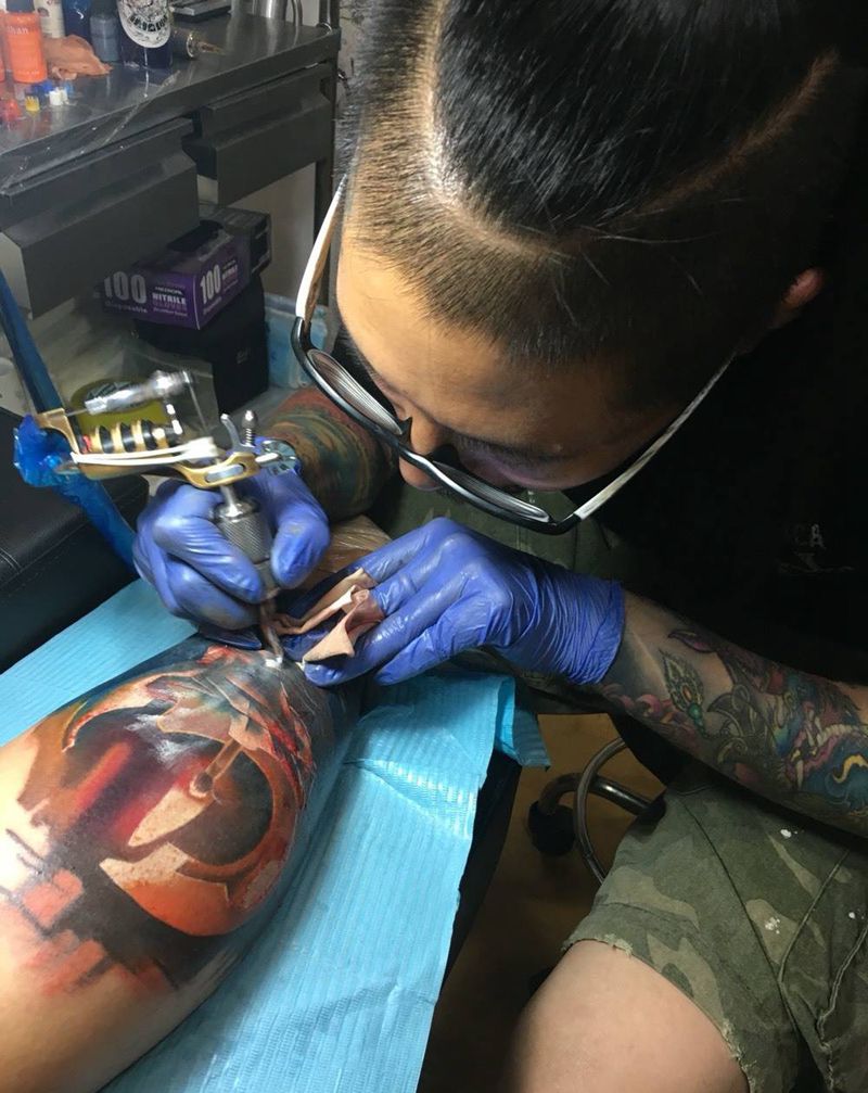 • T包小腿吹火男+阿多福纹身图片_腿部老传统新传统吹火男阿