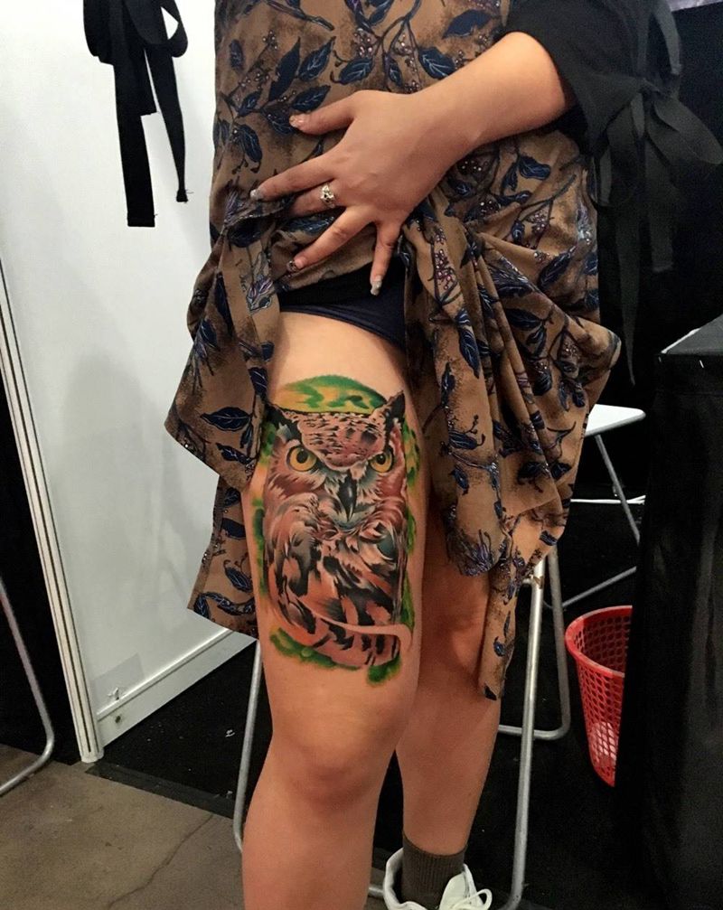 当前位置: 首页 >山东省威海市纹身店-谛听刺青纹身图案>猫头鹰纹身图片_成品腿部欧美写实动物植物纹身图案