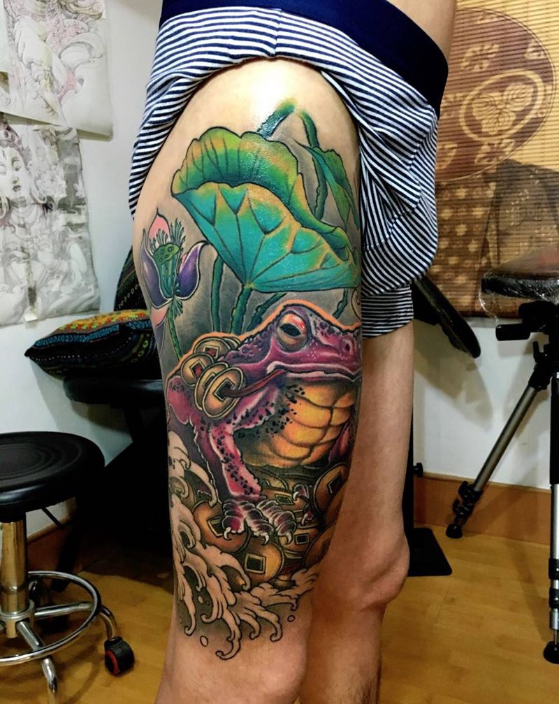 当前位置: 首页 >山东省威海市纹身店-谛听刺青纹身图案>招财金蟾恢复后纹身图片_成品腿部传统动物鬼神植物静物纹身图案
