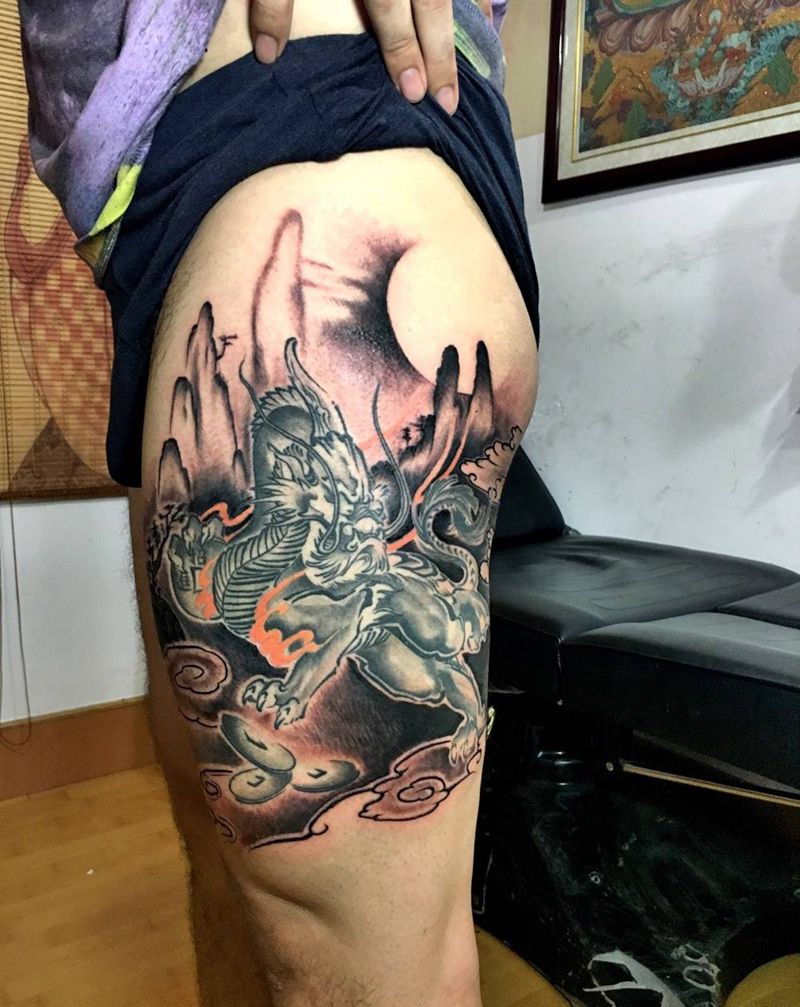 当前位置: 首页 >山东省威海市纹身店-谛听刺青纹身图案>添个背景纹身图片_成品腿部传统国画鬼神宗教动物植物原创水墨纹身图案