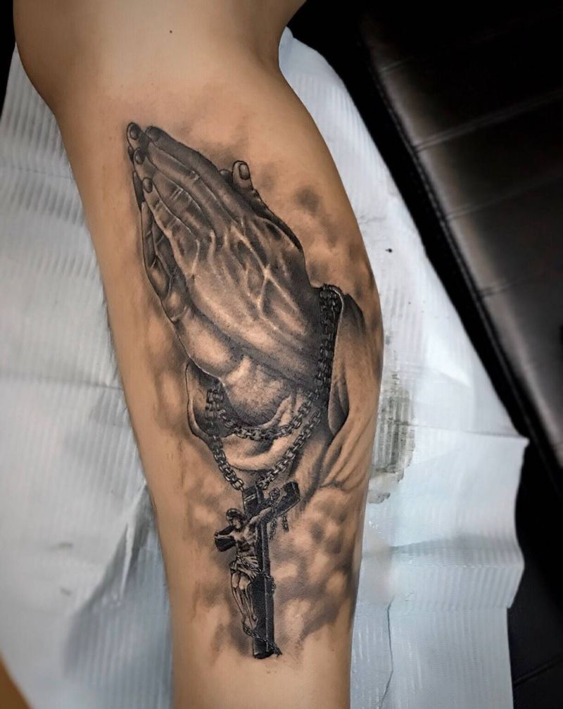 当前位置: 首页 >山东省威海市纹身店-谛听刺青纹身图案>祈祷之手纹身图片_成品腿部脚部欧美写实宗教人物鬼神原创纹身图案