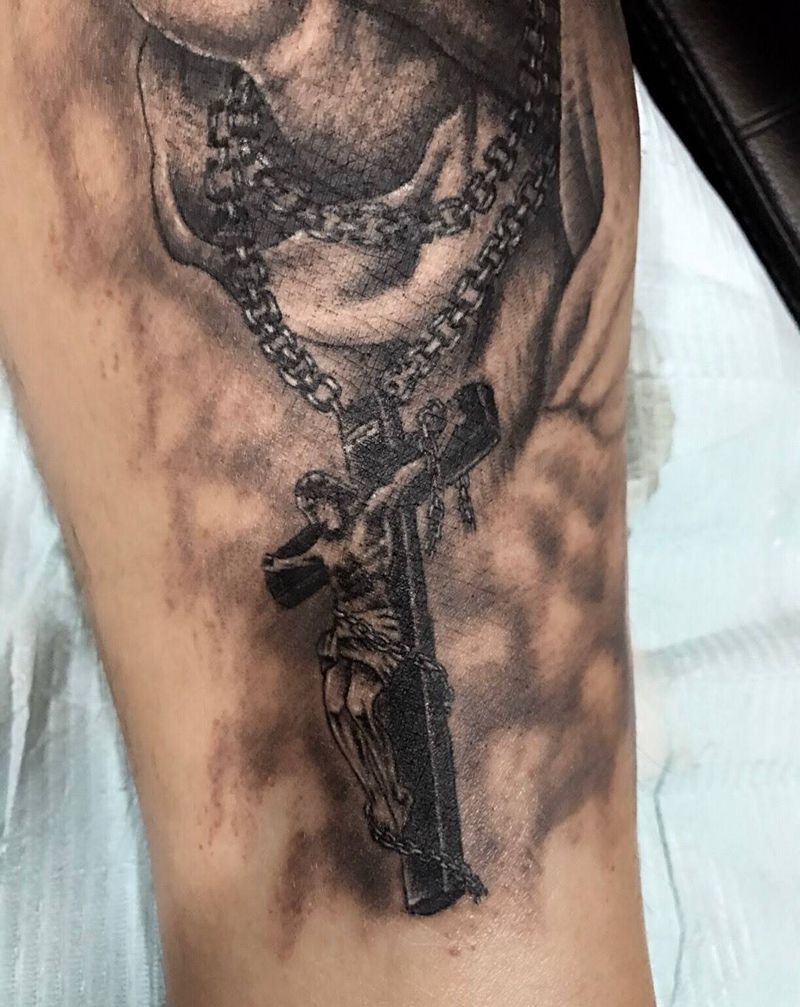 当前位置: 首页 >山东省威海市纹身店-谛听刺青纹身图案>祈祷之手纹身图片_成品腿部脚部欧美写实宗教人物鬼神原创纹身图案
