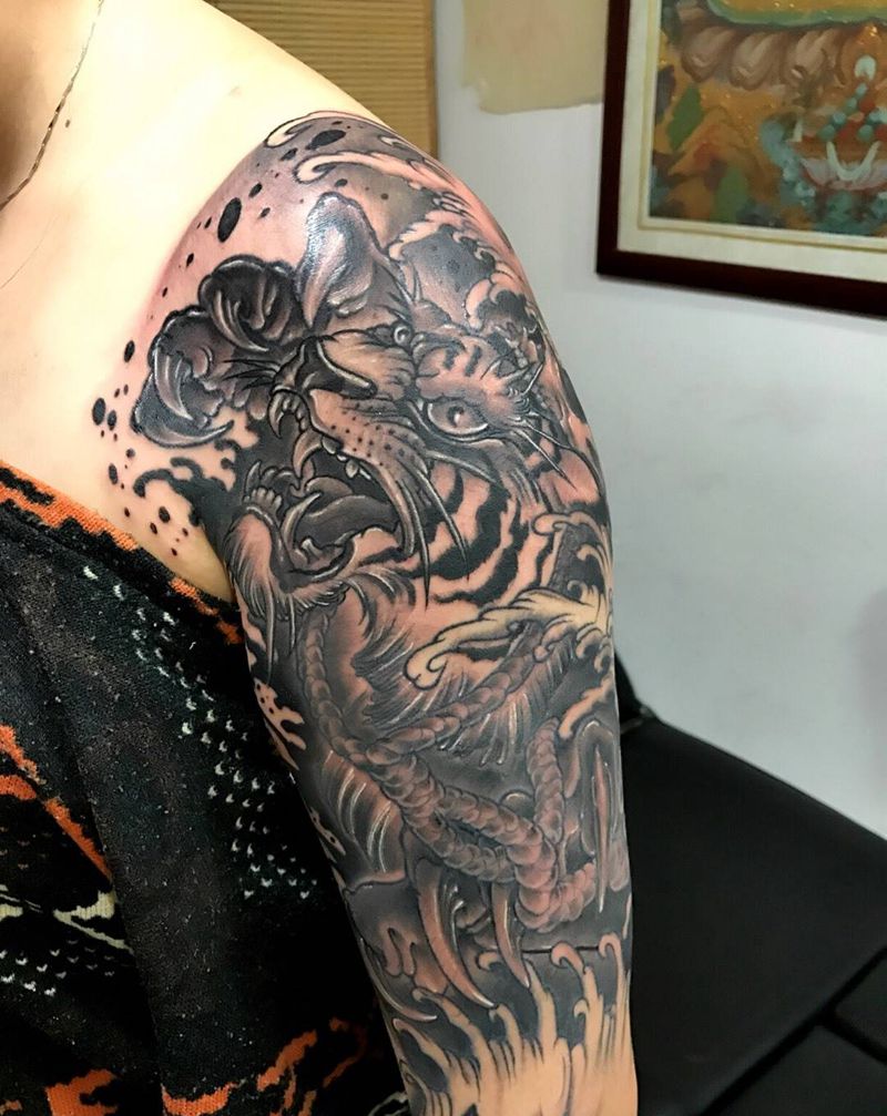 当前位置: 首页 >山东省威海市纹身店-谛听刺青纹身图案>轻松拿下一只东北虎纹身图片_传统动物成品手臂肩部纹身图案