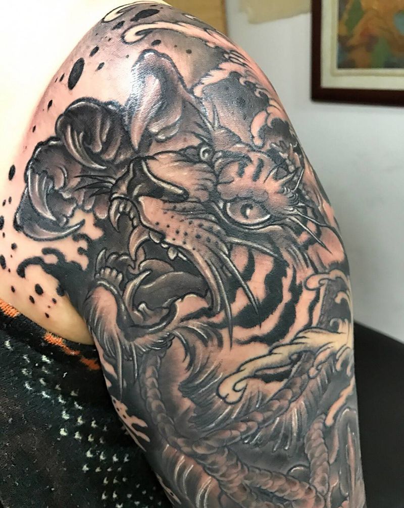 当前位置: 首页 >山东省威海市纹身店-谛听刺青纹身图案>轻松拿下一只东北虎纹身图片_传统动物成品手臂肩部纹身图案