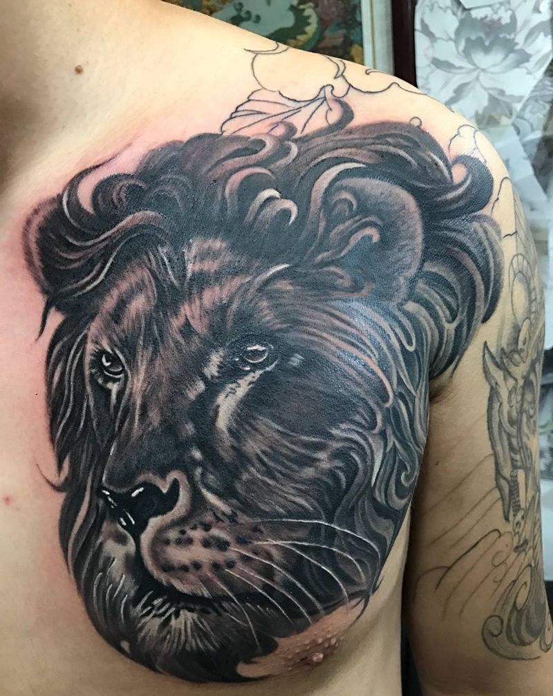 当前位置: 首页 >山东省威海市纹身店-谛听刺青纹身图案>狮子纹身图片_成品胸部肩部欧美写实动物手臂臀部背部腿部纹身图案