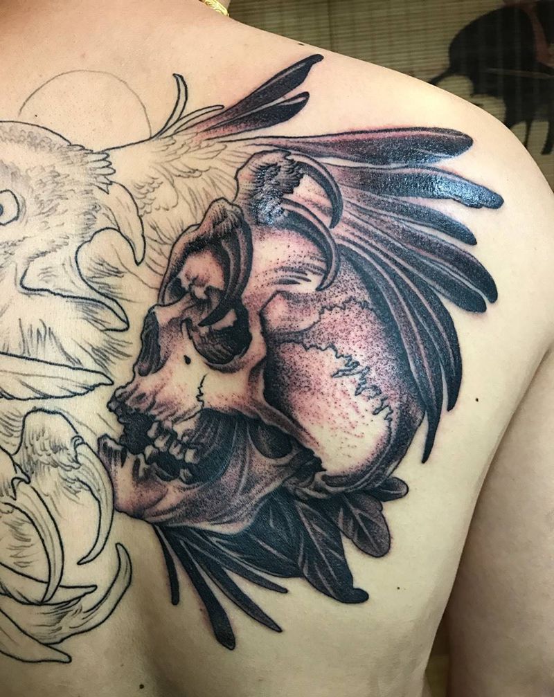 人生,有的活的精彩纹身图片_成品肩部背部欧美清新动物鬼神宗教点刺线条纹身图案