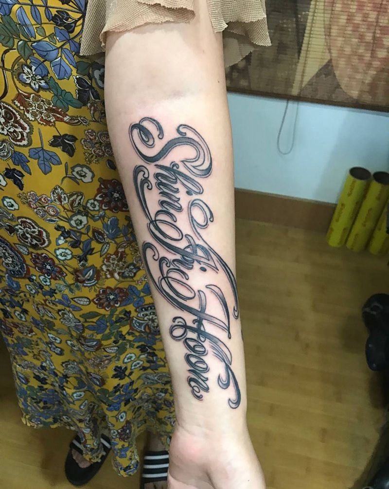 当前位置: 首页 >山东省威海市纹身店-谛听刺青纹身图案>热爱刺青的父母送给小宝贝的纹身图片_成品手臂手部欧美清新字符原创图腾线条纹身图案
