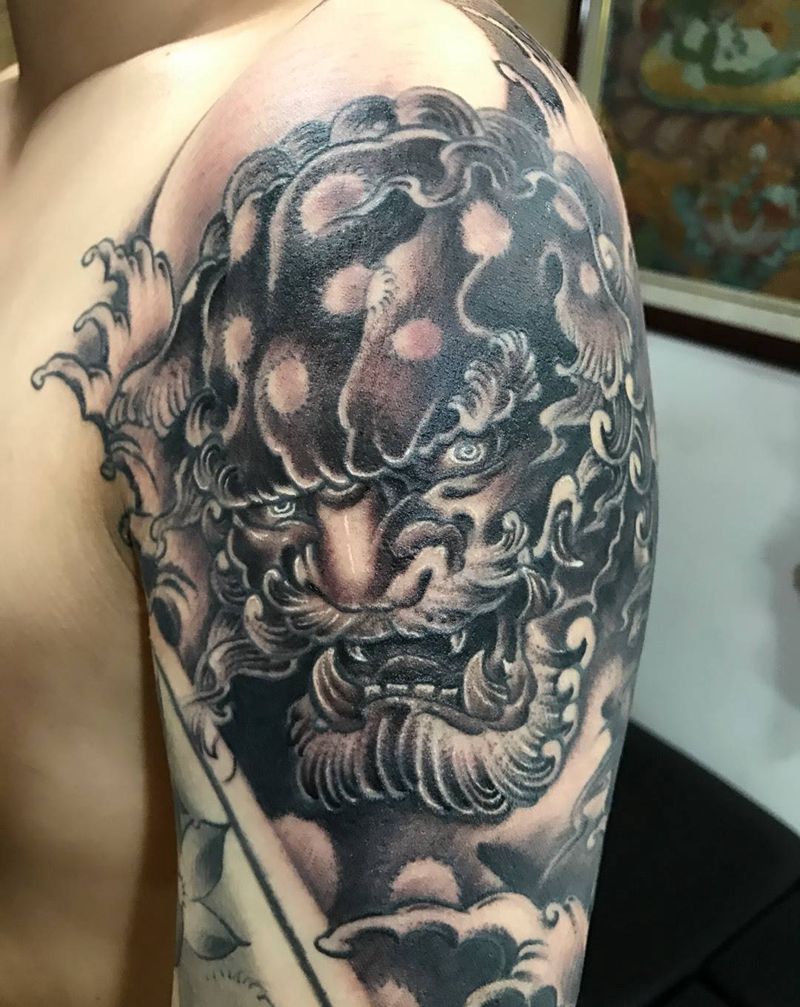 当前位置: 首页 >山东省威海市纹身店-谛听刺青纹身图案>唐狮子纹身图片_成品肩部手臂传统植物动物纹身图案