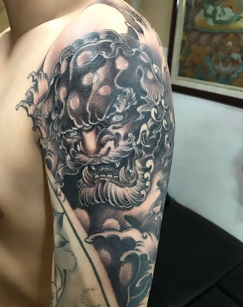 当前位置: 首页 >山东省威海市纹身店-谛听刺青纹身图案>唐狮子纹身图片_成品肩部手臂传统植物动物纹身图案