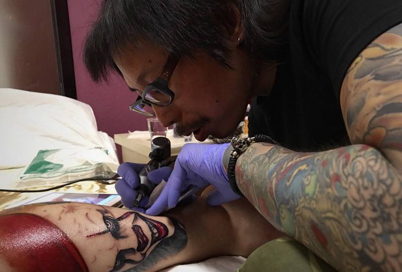 当前位置: 首页 >山东省威海市纹身店-谛听刺青纹身图案>写实风格小丑纹身图片_成品脚部腿部欧美写实肖像人物纹身图案