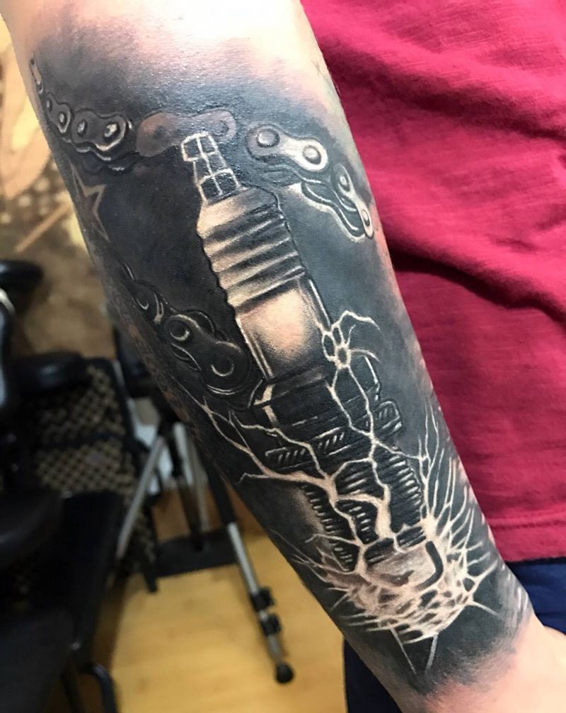 当前位置: 首页 >山东省威海市纹身店-谛听刺青纹身图案>火花塞纹身图片_成品手臂手部欧美写实静物机械纹身图案
