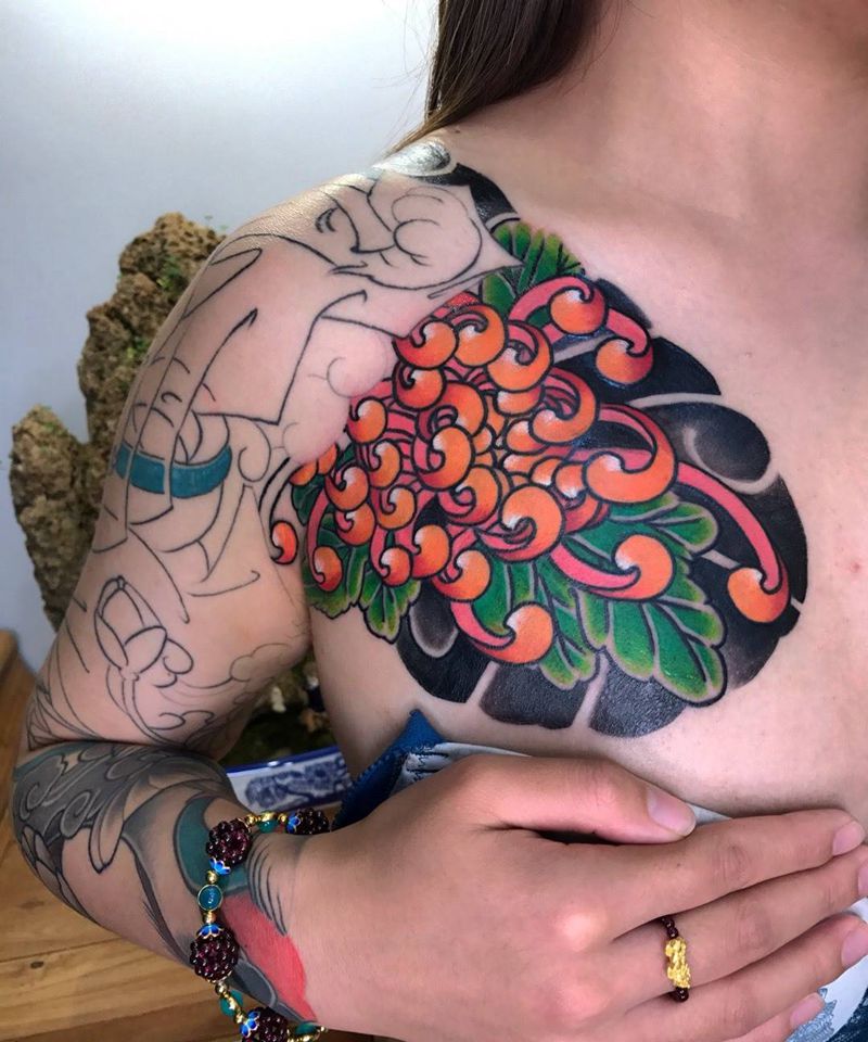 当前位置: 首页 >山东省威海市纹身店-谛听刺青纹身图案>局部纹身图片_胸部肩部老传统新传统菊花花日式纹身图案