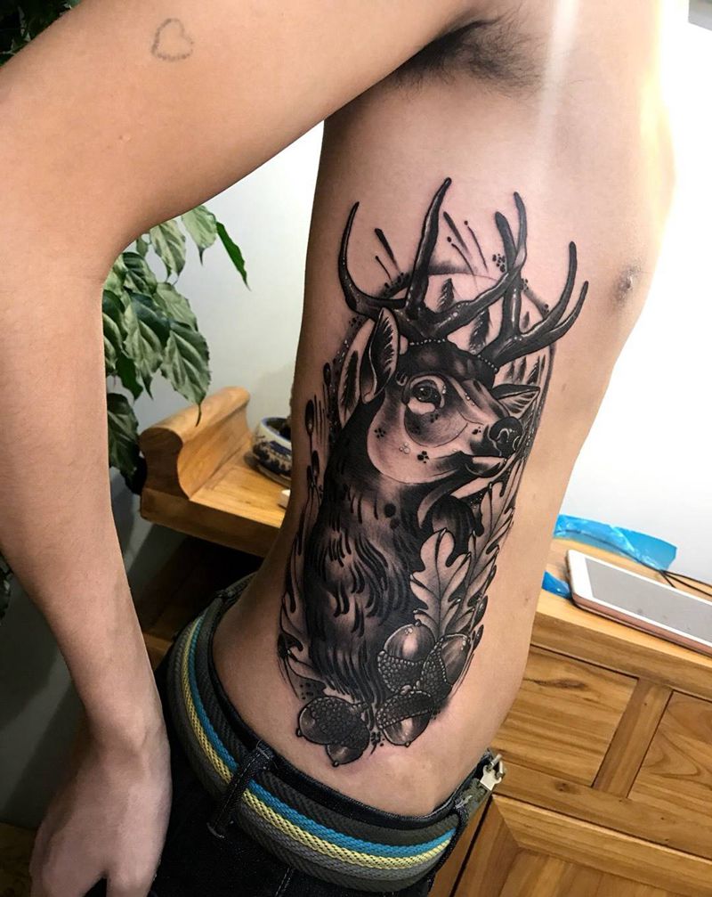 侧腰鹿纹身图片_腰部腹部New School动物鹿鹿角纹身图案