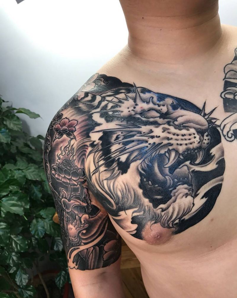 虚空藏菩萨纹身图片_肩部胸部新传统菩萨佛祖老虎纹身图案