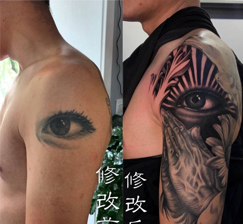 修改作品纹身图片_肩部手臂欧美写实图腾鸽子祈祷手太阳花纹身图案