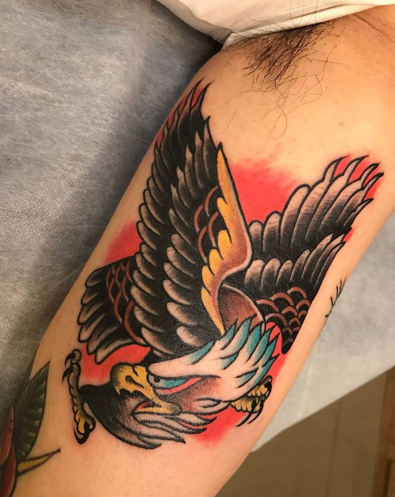 当前位置: 首页 >山东省威海市纹身店-谛听刺青纹身图案>old school纹身图片_手臂手部Old School鹰纹身图案