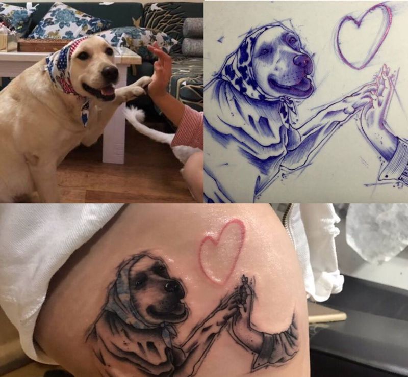 客人家的狗狗纹身图片_腿部臀部几何水彩狗心手纹身图案
