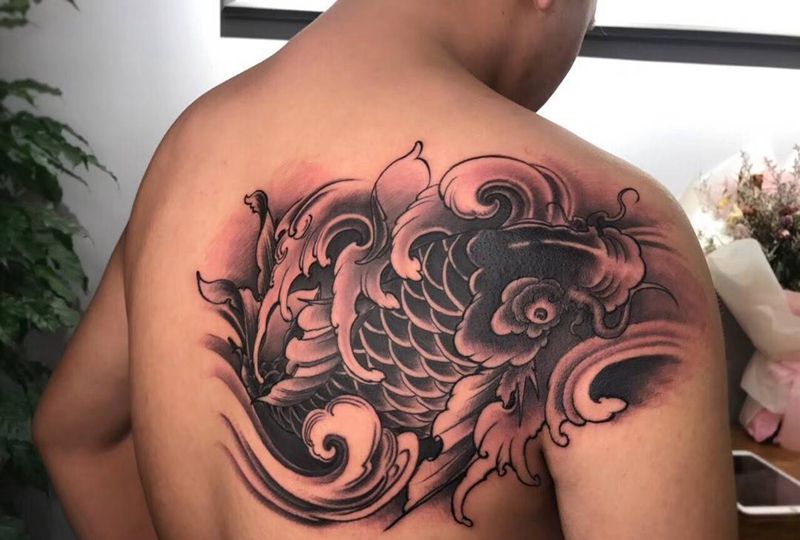 遮盖作品纹身图片_背部肩部新传统鲤鱼浪遮盖纹身图案
