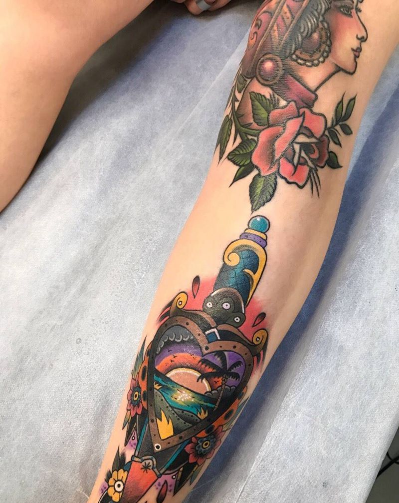 old school纹身图片_腿部脚部Old SchoolNew School太阳山河心纹身图案