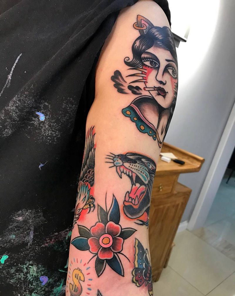 当前位置: 首页 >山东省威海市纹身店-谛听刺青纹身图案>old school纹身图片_手臂手部Old School花复古纹身图案