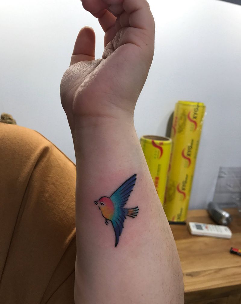 当前位置: 首页 >山东省威海市纹身店-谛听刺青纹身图案>小清新纹身图片_手臂腰部花体字水彩小燕子小鸟英文纹身图案